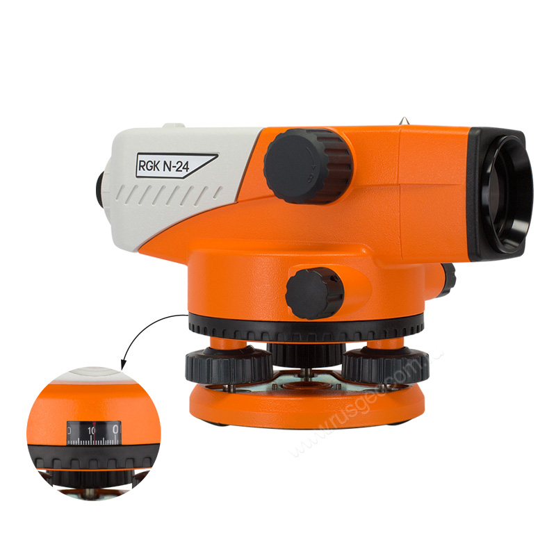 Этот нивелир имеет прямое изображение и 24-х кратное увеличение, что позволяет комфортно работать в любых условиях. Минимальное расстояние визирование составляет 20 сантиметров, то есть с этим прибором можно работать даже в небольших помещениях, коридорах, шахтах или туннелях. Средняя квадратическая ошибка нивелирования составляет всего 2 мм на 1 километр двойного хода, что позволяет использовать нивелир RGK N-24 для большинства стандартных работ.