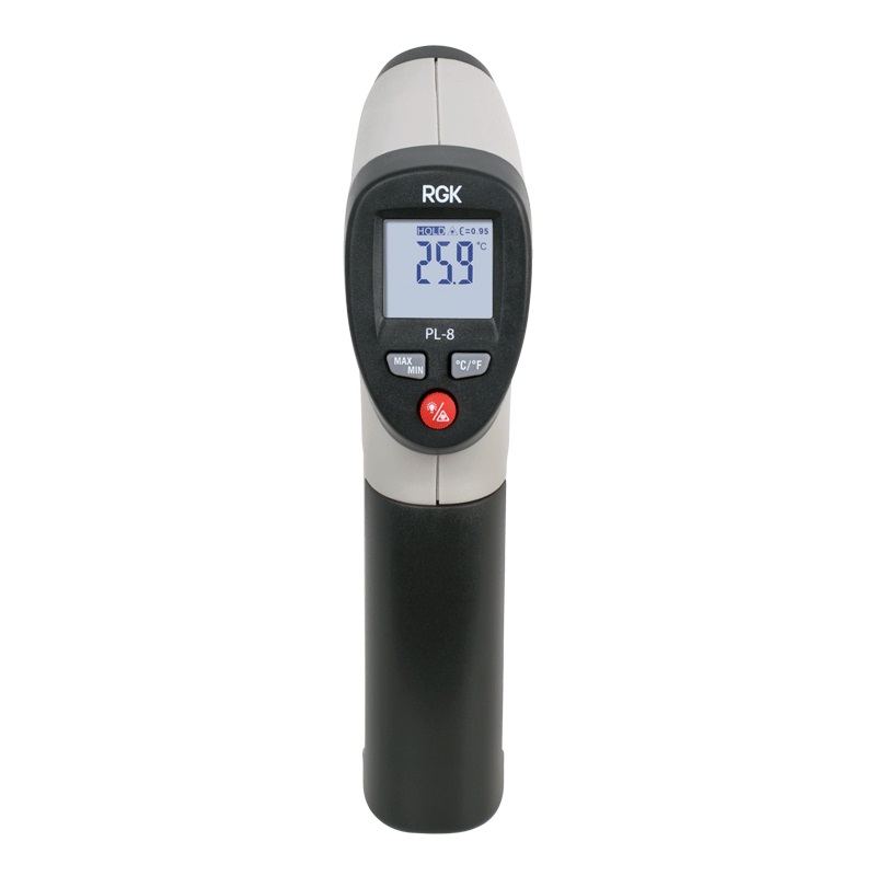 Пирометр RGK PL-8 – это универсальный инфракрасный термометр, позволяющий быстро и безопасно определить температуру любой поверхности. При небольшом весе и компактных габаритах этот инфракрасный пирометр оснащён всем необходимым набором функций и представляет собой самый доступный прибор этого типа на российском рынке. Благодаря своим характеристикам RGK PL-8 идеально подходит для регулярного контроля на производстве, в сфере ЖКХ и в быту, так как невысокая цена и интуитивная простота обращения делает этот пирометр доступным широкому кругу пользователей. Прибор выполнен в виде пистолетной рукояти с большой спусковой кнопкой, что обеспечивает удобство измерения, а инфракрасный метод измерения гарантирует безопасность пользователя даже при работе с сильно нагретой поверхностью или проводниками под током.